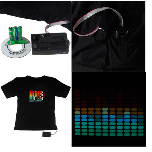 - Não é necessário ligar a camisa em nenhum aparelho de som para as luzes interagirem com a música, basta que haja música ambiente para que as luzes na camisa acendam conforme a batida da música